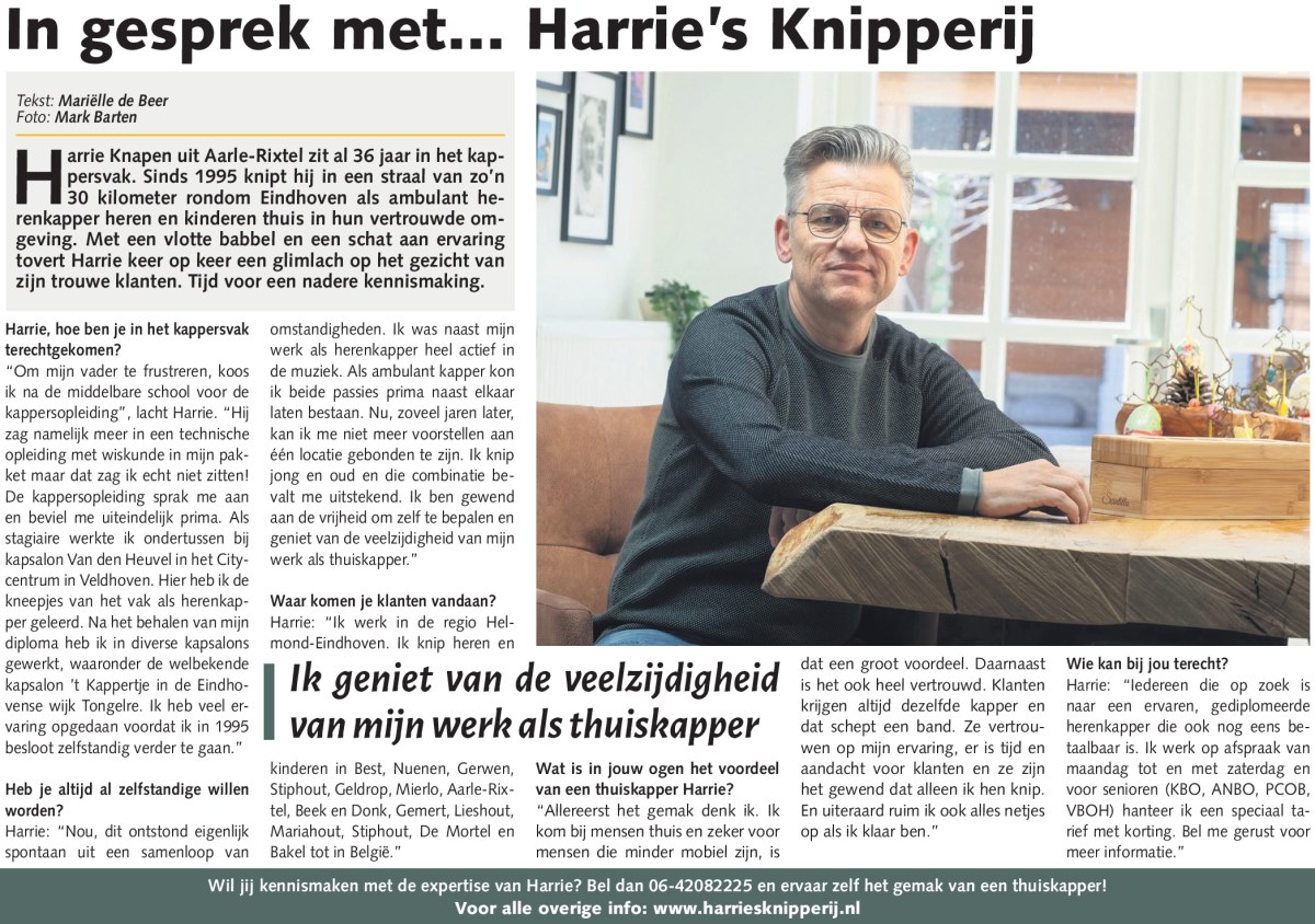 Na het behalen van mijn diploma, en na mijn diensttijd, heb ik in verschillende kapperszaken (waaronder het welbekende kapsalon ’t Kappertje in de Eindhovense wijk Tongelre) ervaring opgedaan. Hierna ben ik mijn eigen weg gegaan onder de naam Harrie’s Knipperij.