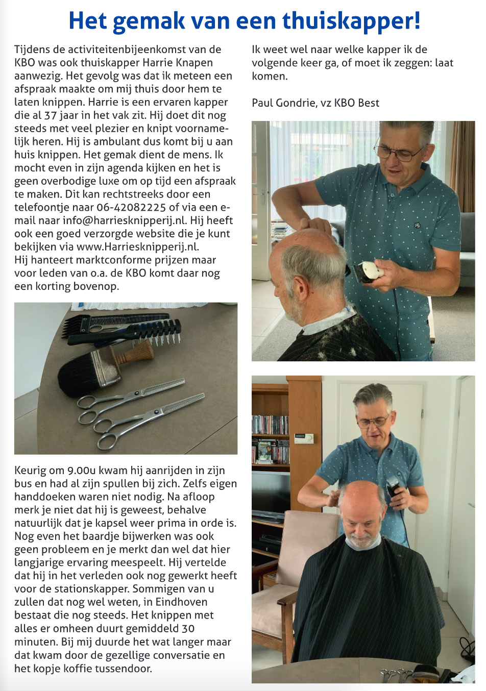 Wat is er nu fijner dan een thuiskapper? U wordt netjes geknipt bij u thuis. En u wordt altijd geknipt door dezelfde kapper. In dit geval door mij, Harrie Knapen, werkzaam als herenkapper in de regio Eindhoven.